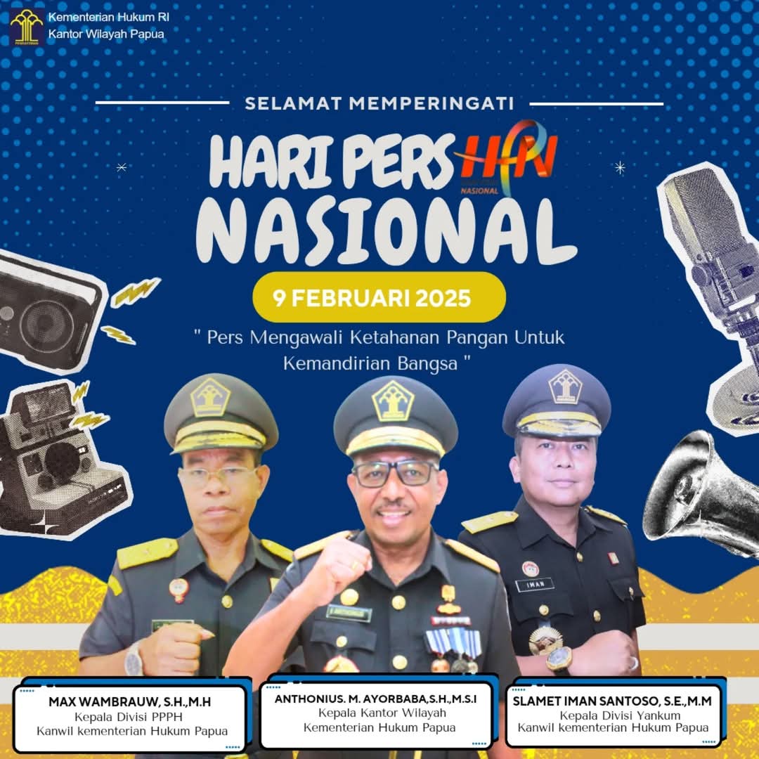 Kepala Kantor Wilayah Kementerian Hukum Papua beserta seluruh jajarannya mengucapkan selamat Hari Pers Nasional 2025!