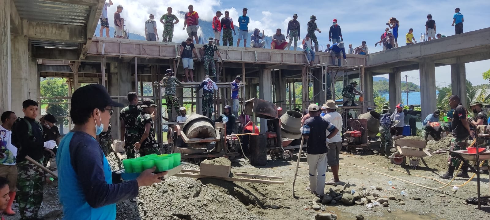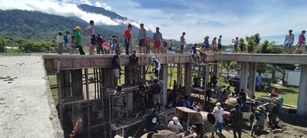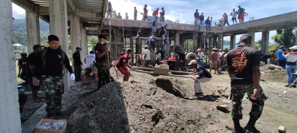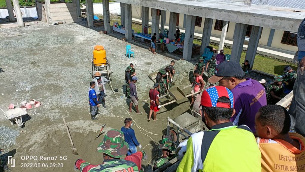 SENTANI, tabloidpapuabaru.com,- Anggota Rindam XVII/Cenderawasih, membantu masyarakat dalam pengecoran balkon Gereja GKI Eklesia Pemda Doyo Baru, Jalan Raya Pemda Doyo Baru, Distrik Waibhu, Kabupaten Jayapura, Sabtu, 6 Agustus 2022.