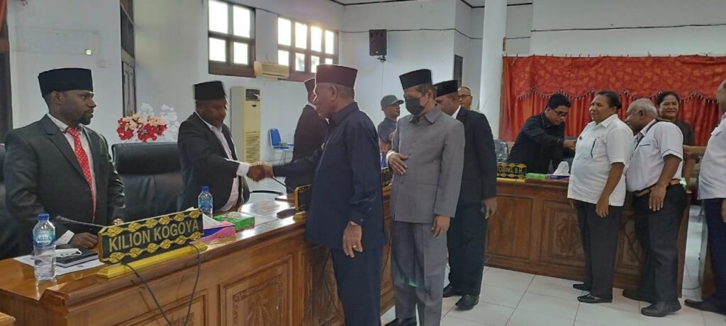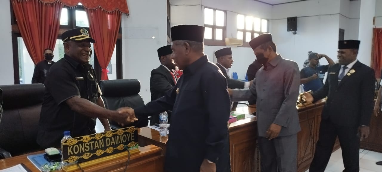 Bupati Jayapura, Matius Awoitauw didampingi Wakil Bupati Jayapura, Giri Wijayantoro dan Ketua DPRD Kabupaten Jayapura, Klemens Hamo dan Sekda Kabupaten Jayapura, Hana S. Hikoyabi, para Asisten dan pimpinan OPD ketika menyalami para anggota DPRD usai penutupan sidang paripuna III masa sidang II tahun 2022, Rabu, 14 September 2022