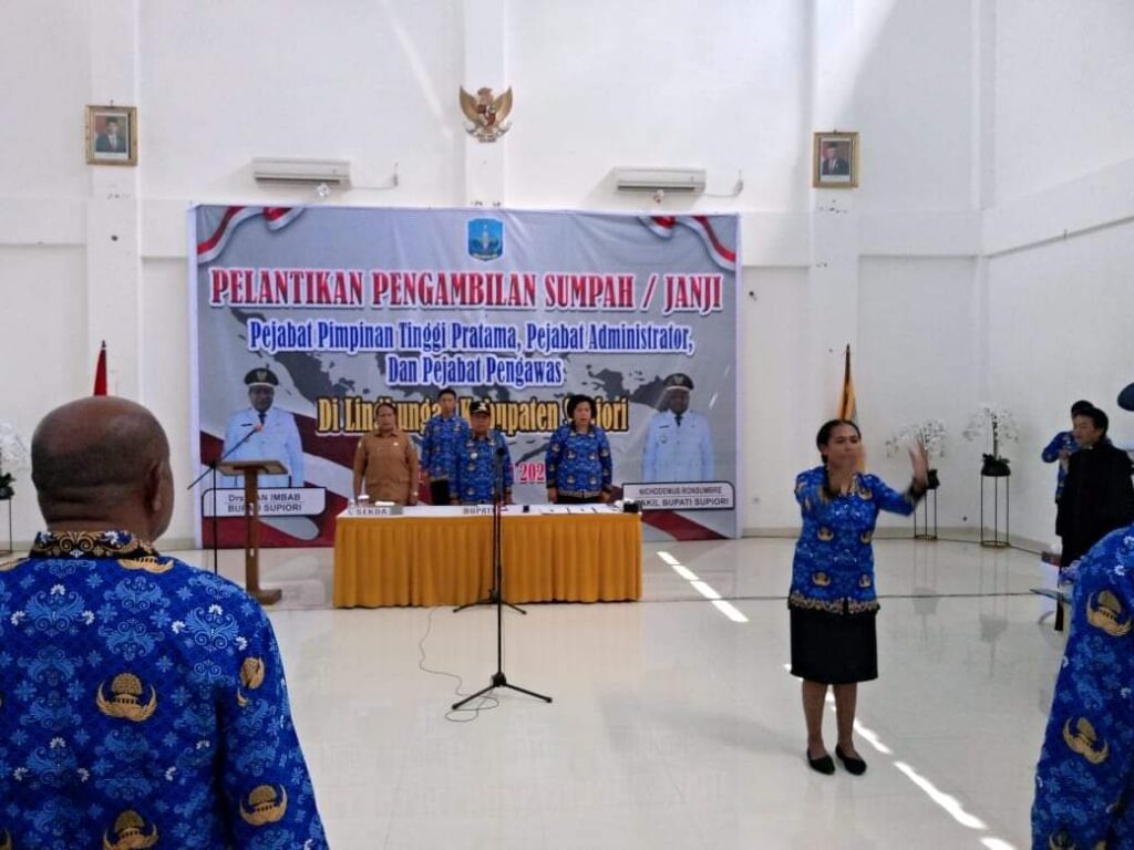 Pelantikan tersebut berlangsung di Aula Kantor Bupati Supiori, Senin (5/6) 2023.