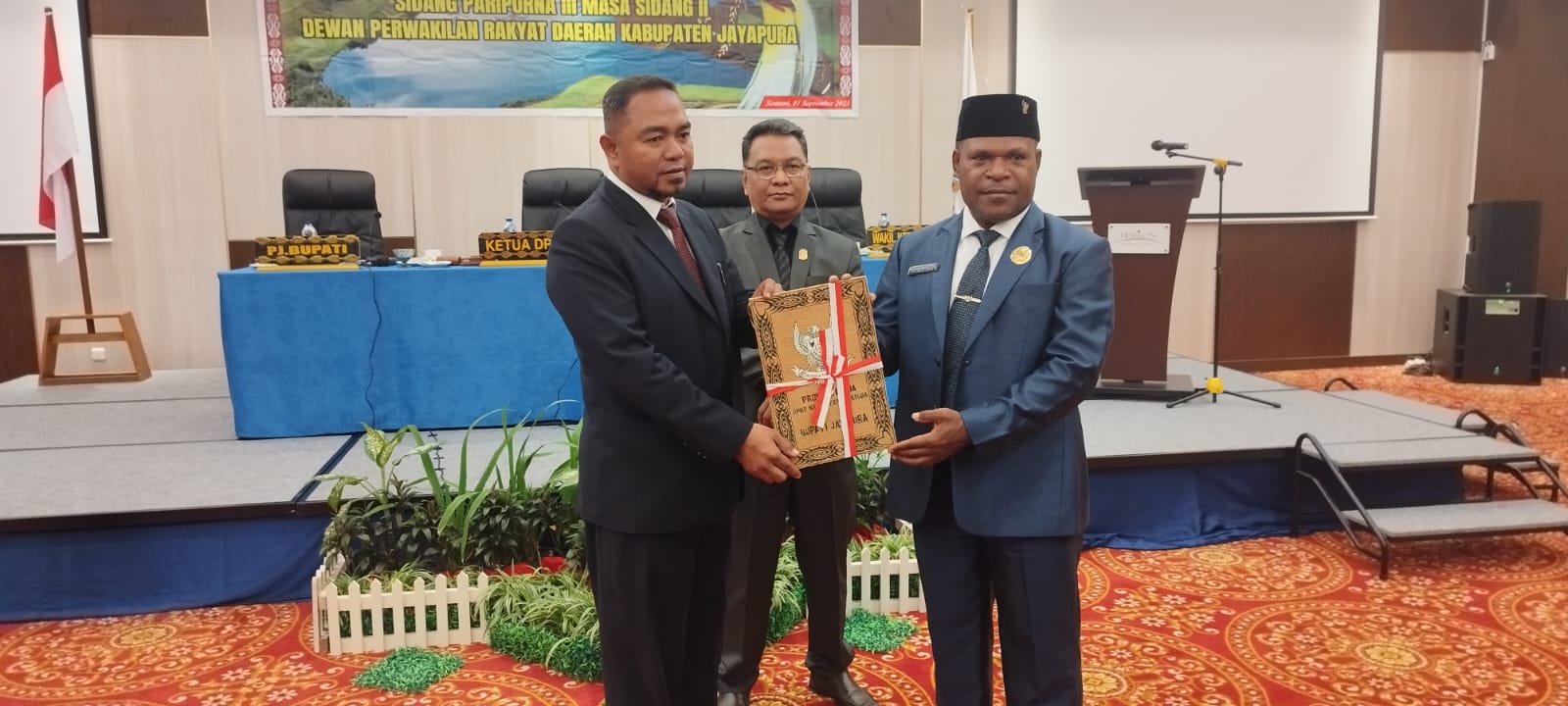 Pj Bupati Jayapura Triwarno Purnomo, S.STP., M.Si., ketika menyerahkan materi Nota Keuangan dan Raperda tentang Perubahan APBD Kabupaten Jayapura Tahun Anggaran 2023, di Ballroom Lantai 6 Hotel Horison Sentani, Kota Sentani, Distrik Sentani, Kabupaten Jayapura, Jumat, 1 September 2023