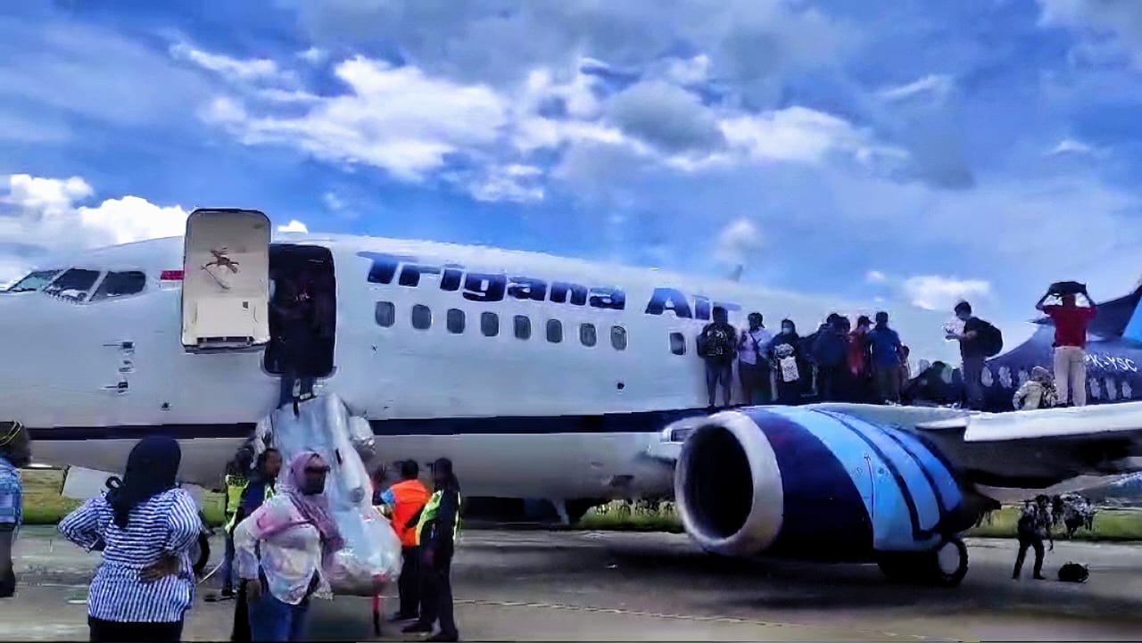 SENTANI | Tabloidpapuabaru.com – Sebuah pesawat Trigana Air dengan nomor penerbangan IL237 jenis Boeing 737-500, yang dijadwalkan terbang dari Bandara Sentani Jayapura menuju Wamena, batal berangkat setelah seorang penumpang tiba-tiba membuka pintu darurat. Aksi tersebut dilakukan saat penumpang tersebut melihat adanya api yang keluar dari mesin pesawat.