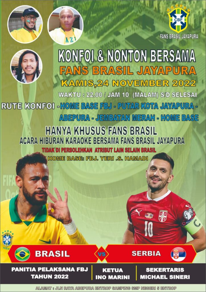 Ketua Fans Brasil Jayapura (FBJ), Ino Marini saat media online ini mengkonfirmasi aktivitas FBJ menjelang pertandingan piala Dunia, Ino mengatakan bahwa khusus Fans Brasil di Kota Jayapura akan menggelar Nonton Bersama (Nober) yang dipusatkan di Home Base FBJ di Entrop.