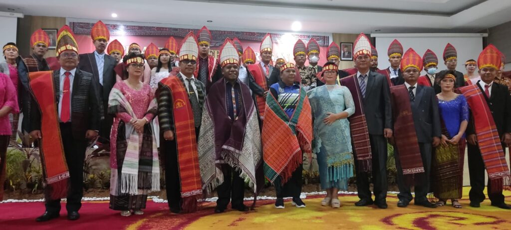 Selain pelantikan pengurus KMB Kabupaten Jayapura, juga dilakukan pemberian Ulos dari tetua adat Batak kepada Bupati Jayapura Mathius Awoitauw sebagai ungkapan cinderamata berupa doa. (ewako)*