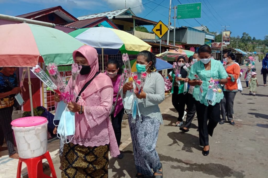 SUPIORI. PapuaBaru.Com,- Memperingati hari Kartini, Rabu (21/4) kemarin, sekaligus memaknai perjuangan dari pada salah tokoh wanita nasional ini, Bhayangkari Kabupaten Supiori melakukan aksi bagi-bagi masker dan bunga kepada sejumlah tukang ojek dan ibu-ibu pedagang di seputaran Sorendiweri, pusat kota Supiori.