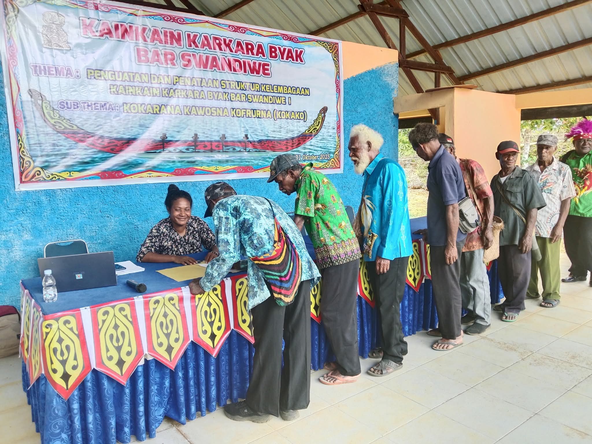 ” kegiatan penguatan dan penataan Hari ini di hadiri oleh kepala kepala adat baik itu marga, kampung dan sub wilayah di wilayah adat Swandiwe telah sepakat untuk membentuk dan memilih ketua di 7 sub wilayah adatnya. 7 kepala atau ketua Sub Fyior ini sekaligus merupakan anggota Dewan Kainkain Karkara Bar Swandiwe periode 2025-2030.” ujar Apolos.