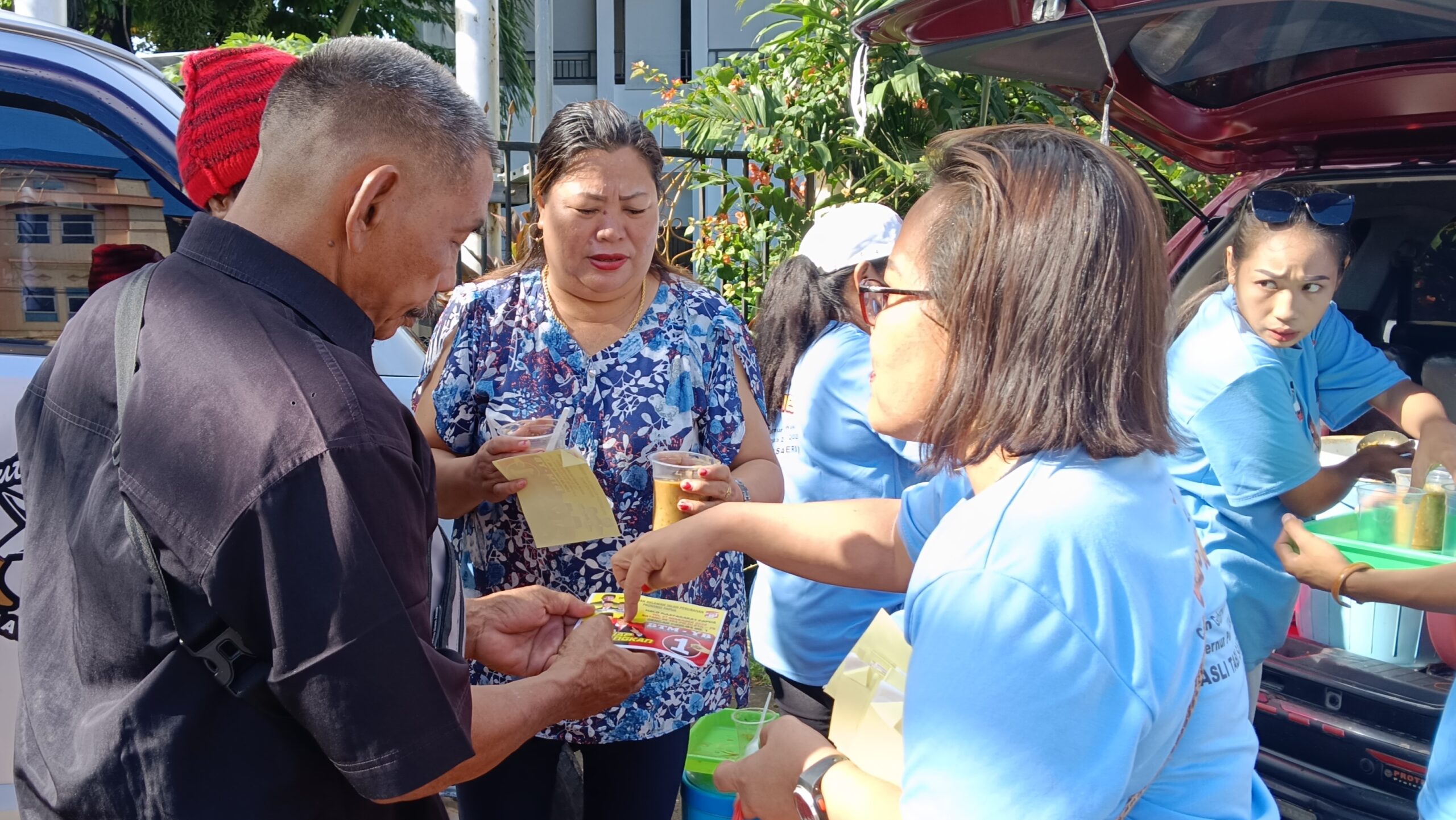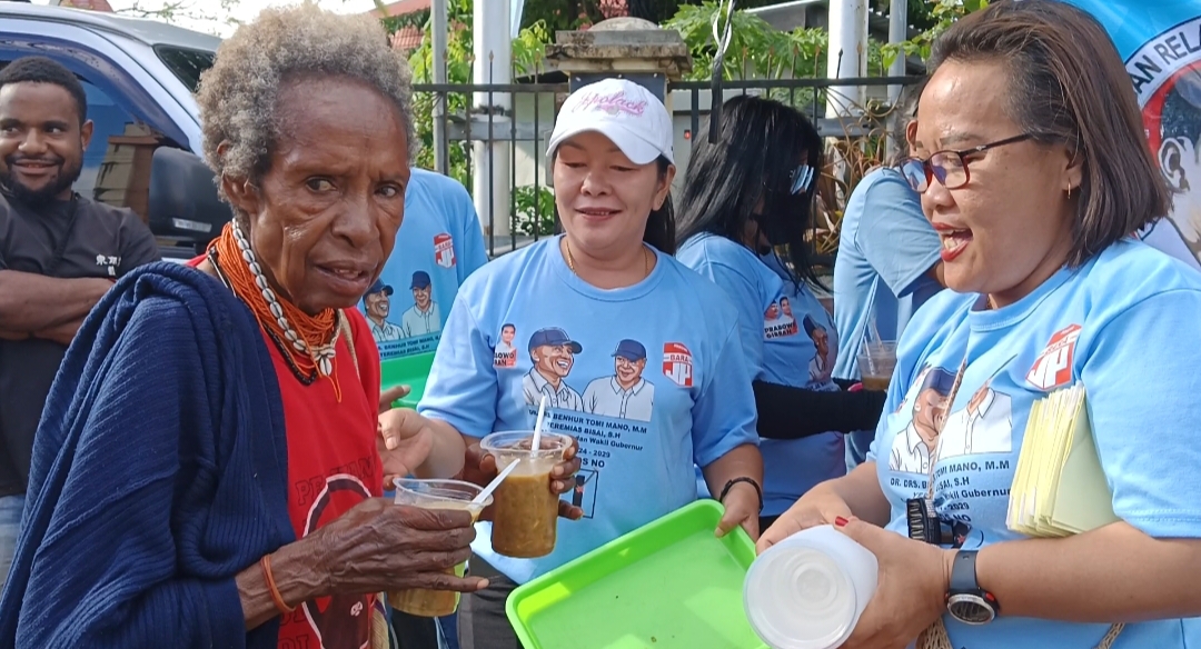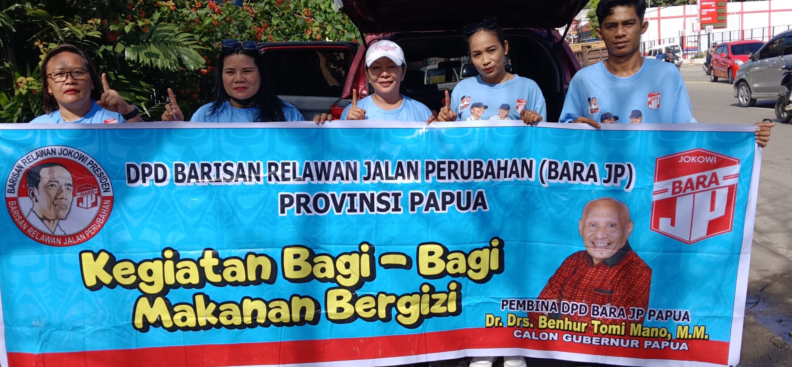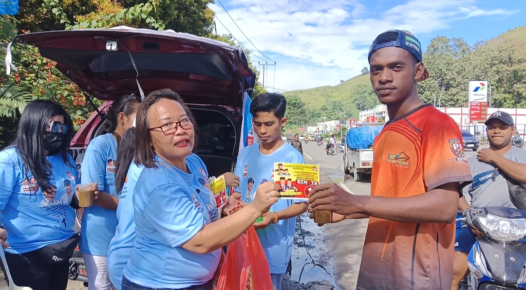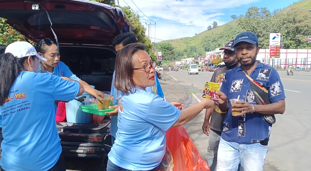 “kami terus lakukan kegiatan sosialisasi kandidat guberur dan wakil gubernur kami yaitu nomor urut 1,bapak BTM-YB dengan turun langsung memperkenalkan calon kami ke masyarakat dengan membagian stiker dan brosur visi dan misi tetapi juga kami bagikan snack gratis kepada masyarakat pelintas jalan raya dan juga mama-mama jualan pinang, pangkalan ojek dan masyarakat pada umumnya,” demikian ungkap Ketua Relawan Bara JP Papua di Sekretariat Entrop Kota Jayapura pecan kemarin.