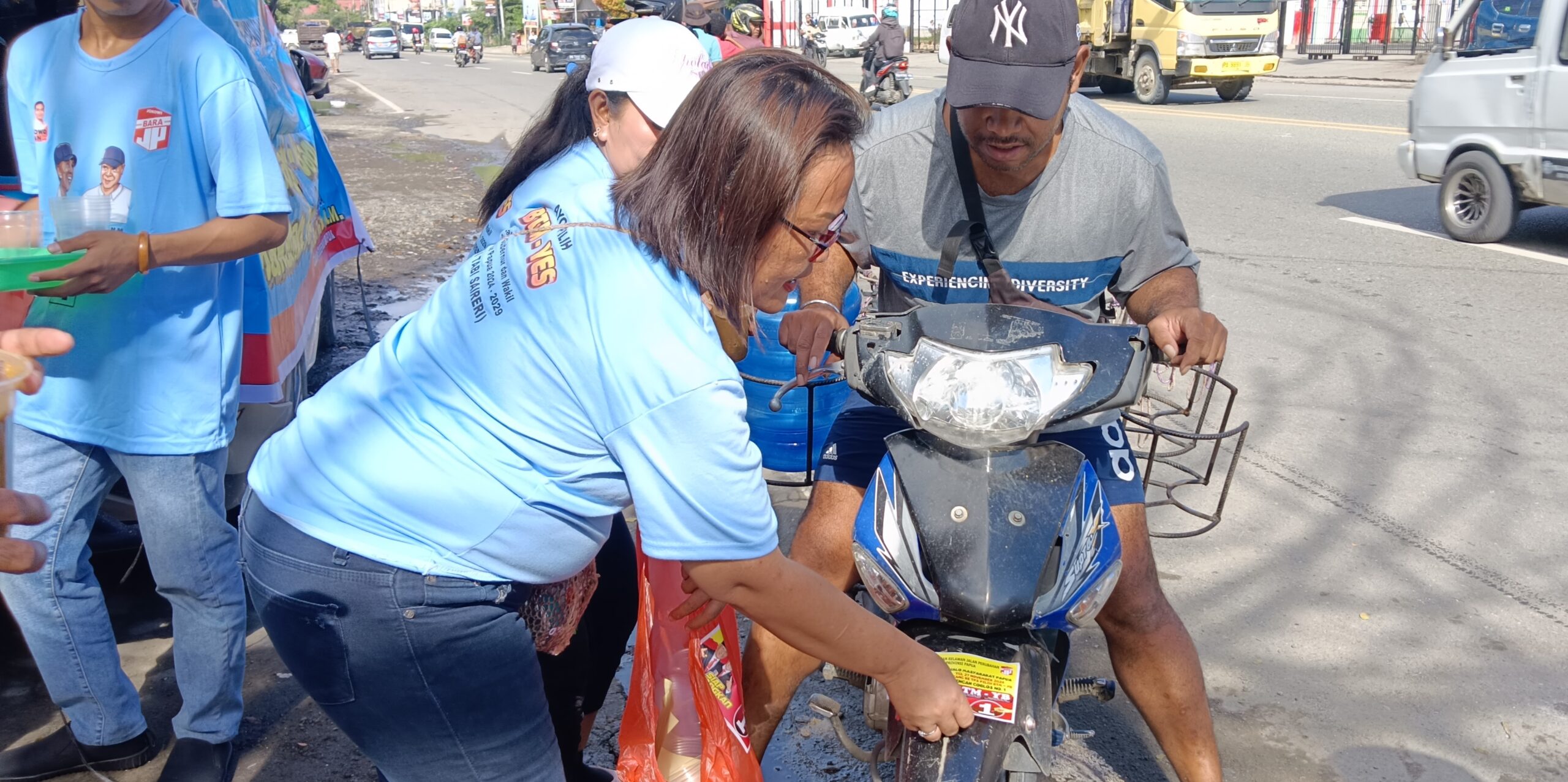 JAYAPURA.tabloidpapuabaru.com,- Relawan Barisan Jalan Perubahan (Bara JP) Provinsi Papua terus melakukan sosialisasi calon gubernur dan wakil gubernur Papua nomor urut 1, Benhur Tomi Mano da Yermias Bisai. Sosialisasi tersebut dalam bentuk menempel stiker BTM-YB pada kendaraan roda dua dan empat sambil membagikan snack gratis.