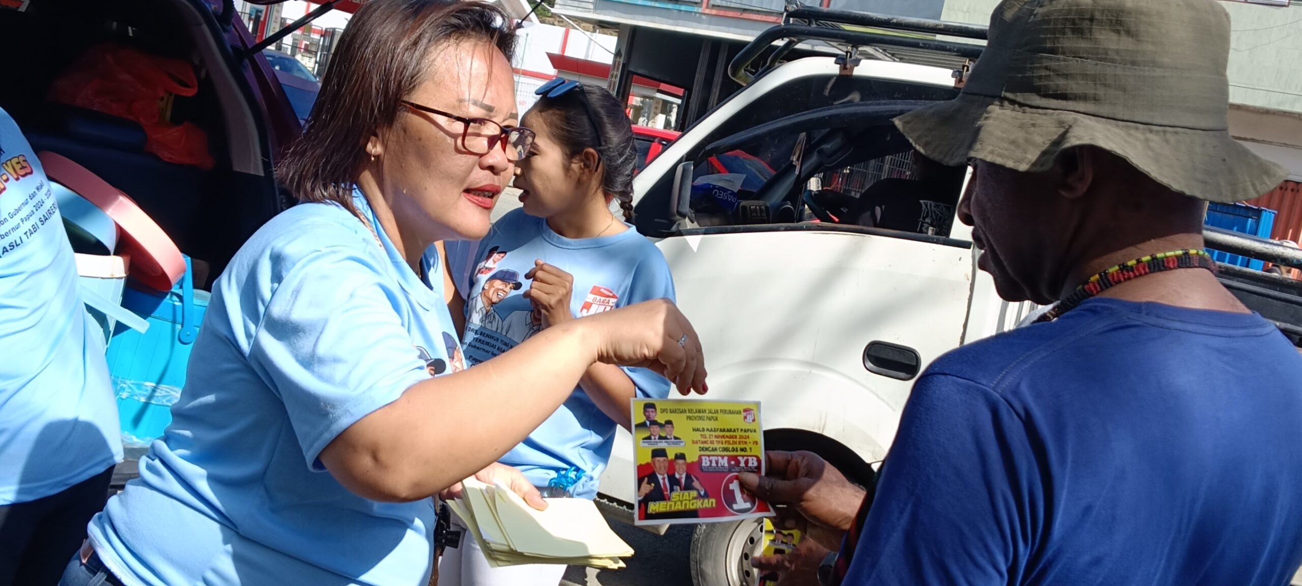 Giat sosialisasi dengan pembagian stiker dan makan gratis telah dilakukan di sejumlah titik seperti jalan poros pasar Youtefa Kelurahan Wimhorock, kemudian Hamadi Resimen, Ekspo Waena, Kampung nelayan dan sejumlah tempat akan disisir untuk terus mendekatkan paslon nomor urut 1 BTM-YB kepada masyarakat.