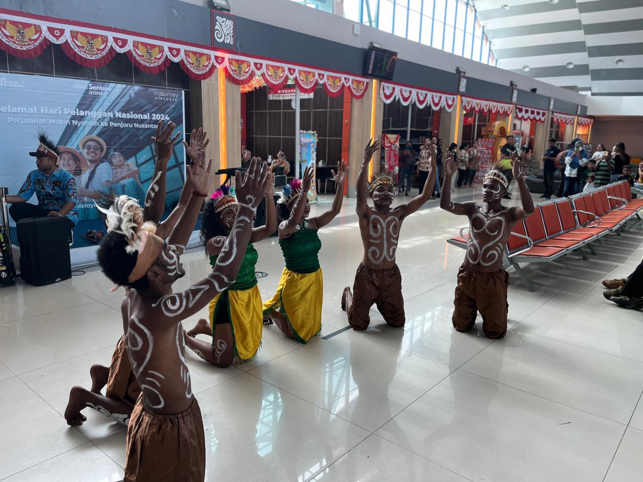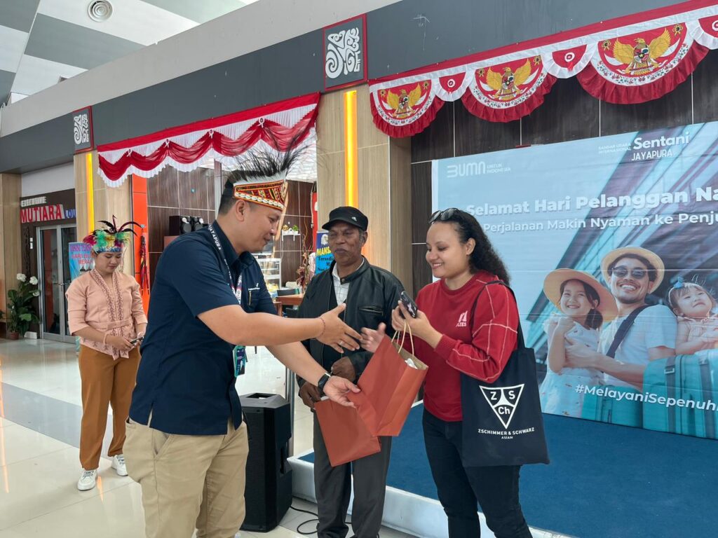 Dalam rangka menyambut Hari Pelanggan Nasional (HarPelNas) 2024, PT Angkasa Pura I Bandara Sentani membagikan souvenir, bingkisan kepada penggunaan jasa penerbangan dan menampilkan musik dan musik dan tarian tradisional yang dibawakan oleh remaja Sanggar Faleremai binaan Dinas Pariwisata Provinsi Papua kata Stakeholders Relation Manager Bandara Sentani Surya Eka.
