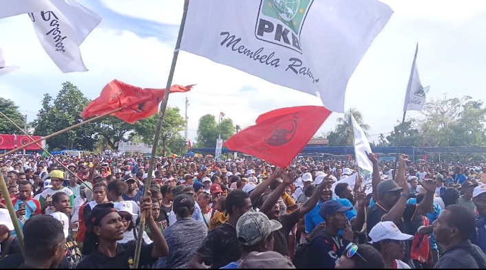 Pantauan media ini, Ratusan kendaraan truk dan pickup serta roda dua iring-iringan membawa massa pendukung DJ dan tiba di lokasi kampanye Lapangan Merdeka Sarmi.