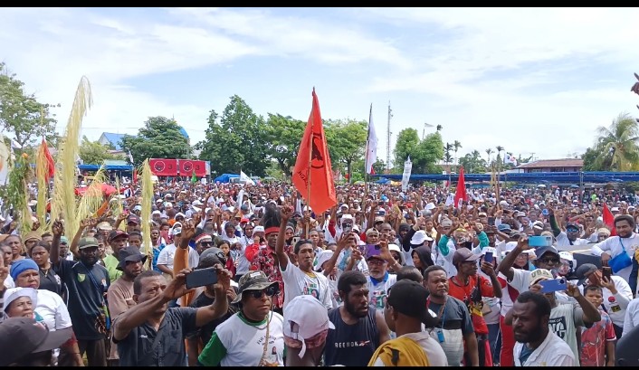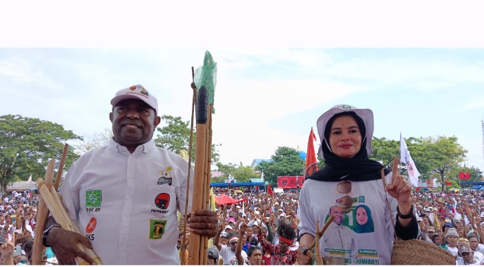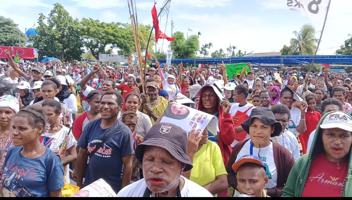 SARMI. tabloidpapuabaru.com,- Ribuan masyarakat Kabupaten Sarmi datang dari kampung-kampung dan Distrik menghadiri kampanye akbar pasangan calon Bupati dan Wakil Bupati nomor urut 01 Dominggus Catue, S. KM, M, Kes dan H. Jumriati, SH atau yang disingkat DJ, berlangsung di Lapangan Merdeka Sarmi – Papua, Sabtu (23/11) 2024.